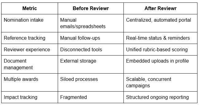 With Reviewr, the American Society for Cell Biology has modernized how it administers the Porter Prizes for Research Excellence and its broader suite of research and professional awards. The platform’s flexible workflows, review tools, and automation ensure a transparent, equitable, and scalable awards process that honors scientific achievement and supports ASCB’s mission to advance cell biology knowledge and community. The system’s ability to manage both nomination complexity and post-award impact reporting has strengthened ASCB’s award strategy and enhanced participant and reviewer experiences.
