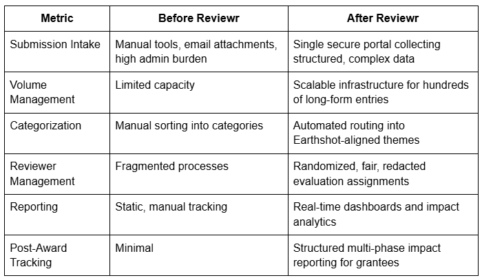 Through Reviewr, the JFK Library Foundation empowered a modern, data-driven innovation challenge capable of supporting climate-forward solutions at scale. The platform ensured that every applicant—regardless of organization size—had a clear, equitable path to participate. Review committees gained the tools needed for fair, rigorous evaluation, and the Foundation gained lasting visibility into innovation outcomes.