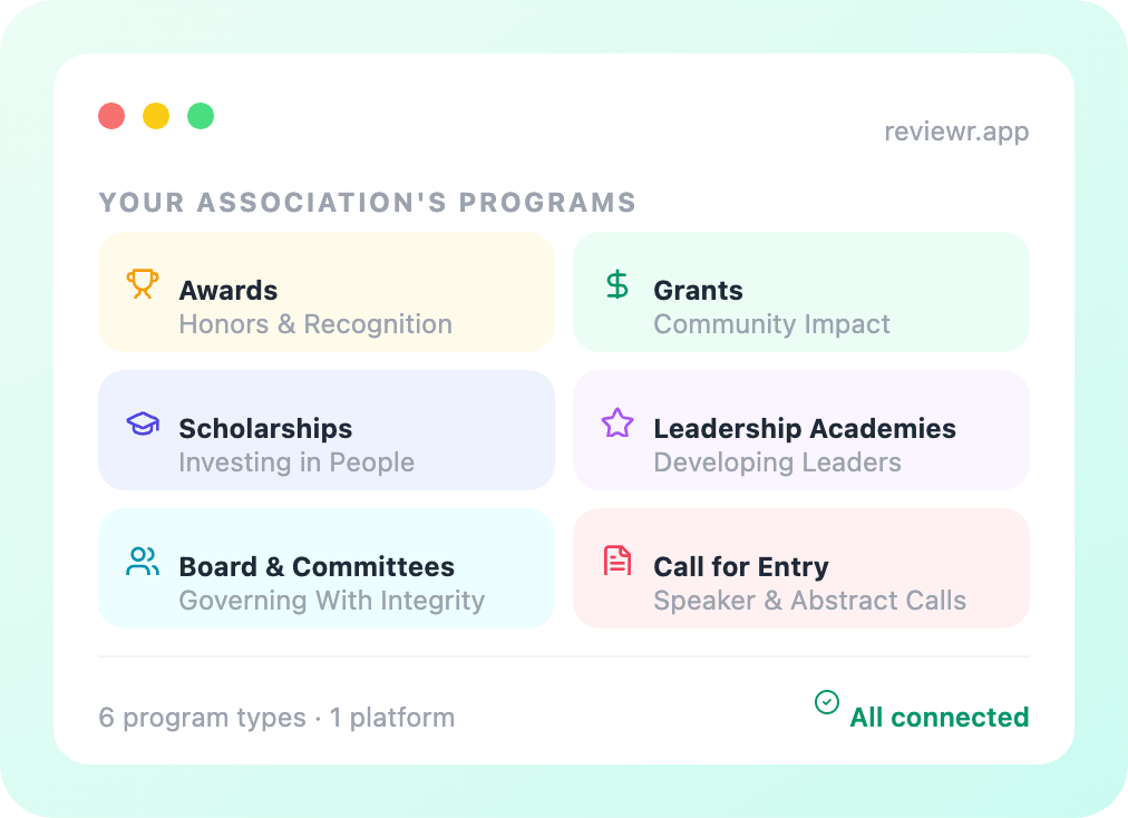 You're spending more time managing processes than delivering the member experiences your association was built to provide. Reviewr replaces the patchwork of form tools, email threads, shared drives, and scoring spreadsheets with one connected platform across every program your association runs.